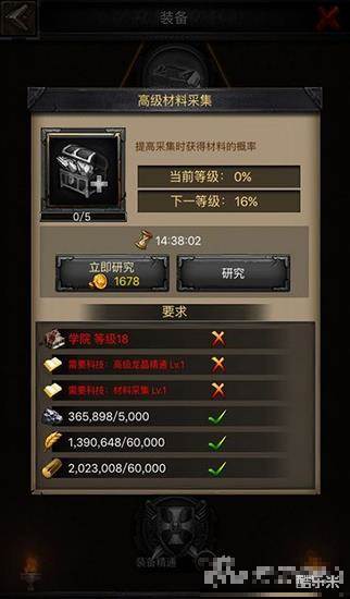 高级材料采集这一项科技需要领主将学院等级升到18级,并且研究了一级高级龙晶精通和材料采集的科技才能开始研究。这项科技的效果是提高领主派遣部队去野外采集时获得装备材料的概率。我们都知道锻造高等级装备最缺的就是大量的装备的材料了,这项科技对于想要合成高等级装备的玩家来说无疑是非常有用了。