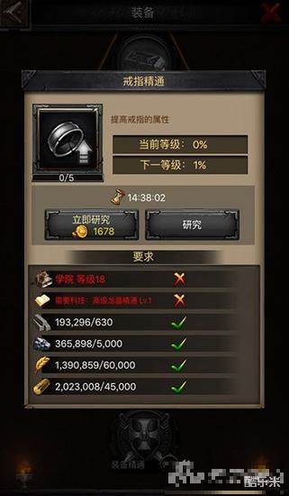 戒指精通的科技需要玩家的学院等级建设到18级,还需要玩家研究出一级的高级龙晶精通作为前置科技才能研究。戒指这件装备的主要属性是科技研究加速,前期的戒指一般都附带有这项属性,高等级戒指分支变多之后属性会更加丰富一些。总的来说,戒指的属性对于领主的发展是很有用的。