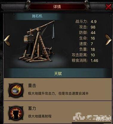 抛石器的攻击力达到了惊人的98点,在所有的七阶兵种里都是鹤立鸡群的。相比之前的投石部队,抛石器的防御力也是大大的提升,然而生命值依然很低。这也意味如果没有强大的前排保护,抛石器损耗起来也是很快的。建议玩家在编队时优先保证充足的前排,然后在编制抛石器部队。到了游戏后期,战车类部队的低速度往往会拖累整场战局,因此在使用时要注意分析情况。在阵地战中抛石器还是能发挥很大作用的,长途奔袭战最好能够配合行军加速道具。