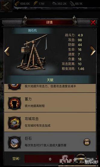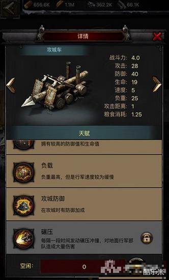 今天,我们就来看看战车部队的新天赋是什么样的。战车部队分为两大类,即冲车和投石车。这两种部队的定位不同,新增的天赋也是不一样的,我们首先便来看看这新增的两个天赋的说明吧。