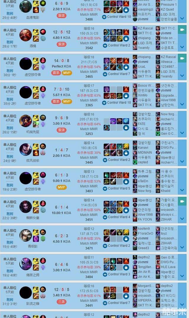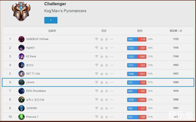 近期众多韩服高分段OB主播都会在韩服高分段碰见这样一个国产打野选手,他的ID是:ylxmml。擅长盲僧、蜘蛛、卡密尔、赵信等进攻性极强的打野,目前处于韩服总榜第六的位置。而且在韩服王者前十的玩家中,他的胜率是最高的。