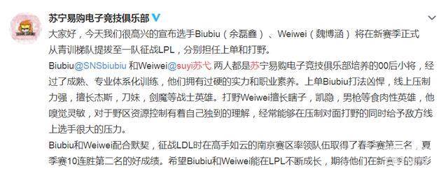 这个国服玩家的庐山真面目是谁呢?就是在半个月前SN刚刚从青训队提拔到一队替补的打野选手weiwei,中文名字叫魏博涵。他和SN的上单biubiu是好搭档。未来这两个小将一定会在SN大展拳脚。