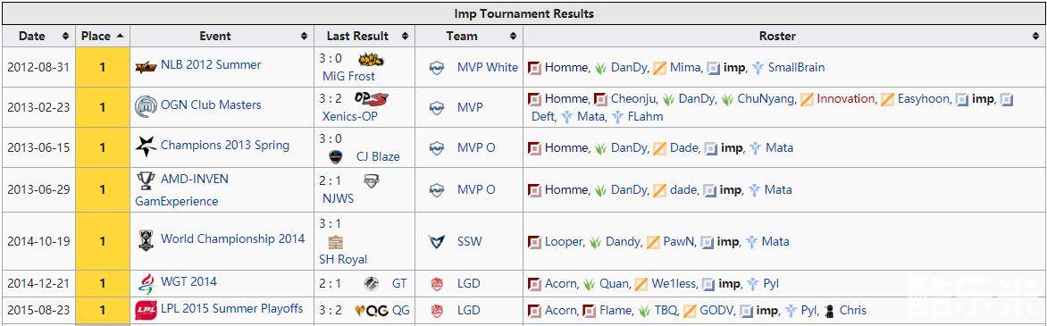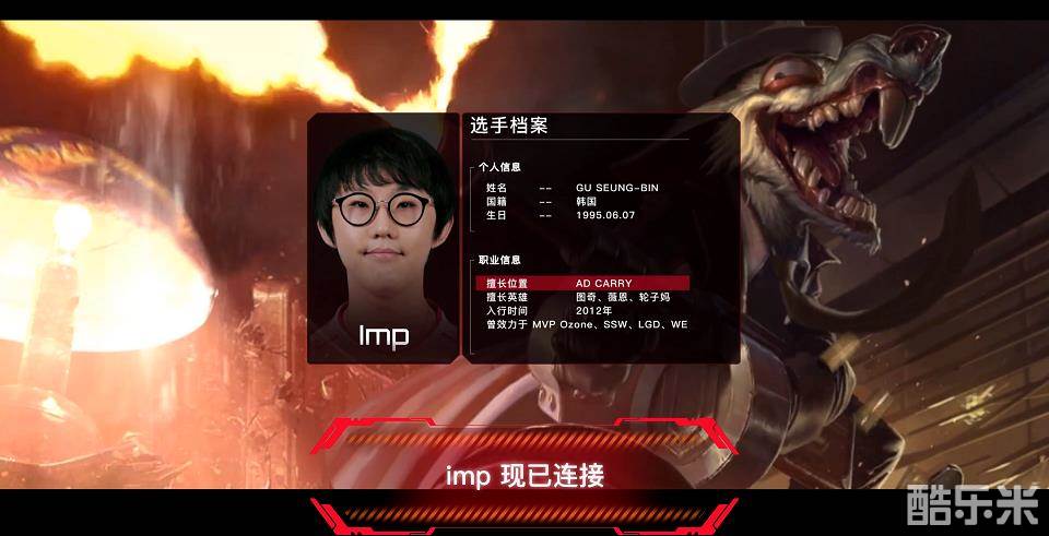 Imp 可以说是 LPL 观众们最熟悉的韩援之一。他在 2012 年就开始了自己的职业生涯,在韩国赛区将 NLB、OGN 大师赛、OGN 联赛冠军 悉数收入囊中。2013 年 imp 首次登上 S 总决赛,虽然当年他所在的 SSO 折戟成沙。但一年之后他们就卷土重来,拿下了 S4 世界总决赛冠军,imp 也登上了自己职业生涯的巅峰。2015 年,imp 来到 LPL,正处巅峰的他又帮助 LGD 拿到 LPL 2015 春季赛亚军、夏季赛冠军,并再次杀入 S 总决赛。