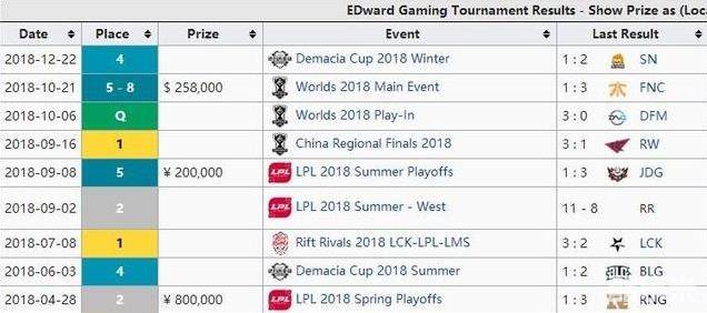 除了RNG和IG之外,成绩最好的应该是EDG战队,EDG这边整个2018年只拿到了三个赛事奖金,分别是LPL春季赛亚军80W人民币,LPL夏季赛第五名20W人民币,以及S8全球总决赛八强26W美元,一共是278W人民币的奖金。