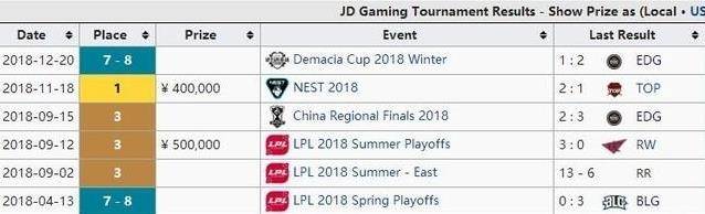 那么来看看差一步打进LPL的JDG战队,JDG在整个2018年所获赛事奖金只有两个,一个是LPL夏季赛季军奖金50W人民币,一个是NEST冠军40W人民币,整个2018年的赛事奖金一共是90W人民币。