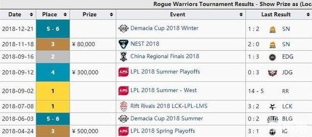 RW和JDG一样,也是差一点打进了S赛,2018年所获奖金有三个,一个是LPL春季赛季军奖金50W人民币,一个是LPL夏季赛殿军奖金40W人民币,还有一个是NEST季军奖金8W,一年下来奖金拿到了98W人民币,比JDG还高一点。