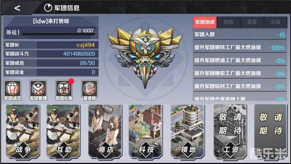 1)主界面下方按钮”军团”,点击可以查看当前所在军团的基本信息。包括:军团加成、动态、宣言、公告等。