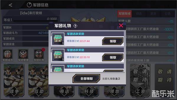 3)点击”军团礼物”按钮,可以领取全员宝箱奖励。只要军团内成员每日登陆游戏、购买游戏内礼包、组队击杀铁鹫boss即可获得全军团宝箱奖励。