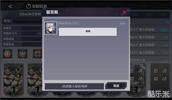 4)点击”留言板”按钮,可以查看到所有玩家在军团中的留言。军团好不好看了才知道!