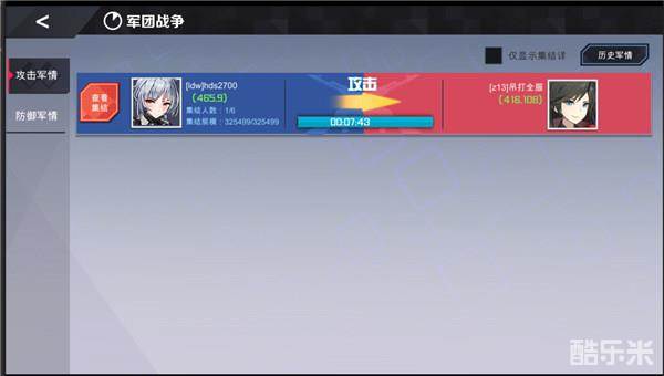 5)点击”战争”按钮,显示军团成员的战争信息。在这里可以了解成员正在进行的战争,包括进攻或者防御。历史军情中记载了军团大大小小的战役,点击即可查看。
