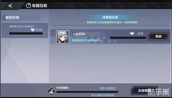 6)点击”互助”按钮,显示我的求助信息以及军团成员的求助信息。点击帮助可以减少建筑升级或研究科技的CD时间,每次帮助还可以获得军团币。