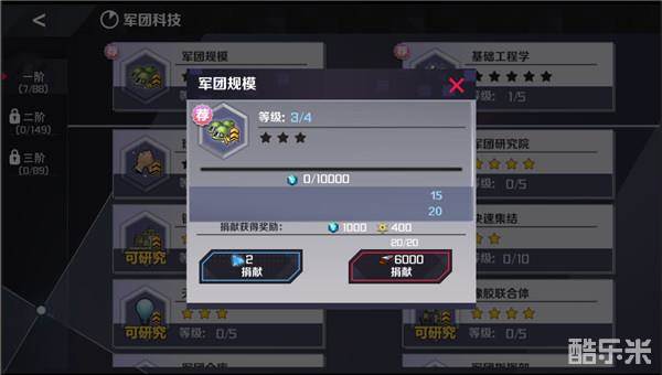 8)点击”科技”按钮,可以对科技捐献资源或钻石,进度值满了之后可以研究,研究可以使全军团成员获得属性加成。捐献还可以获得军团币。
