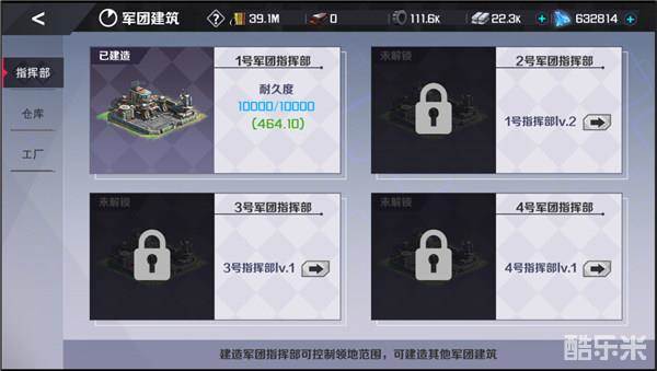 9)点击”领地”按钮,可以查看军团建筑信息。军团建筑包括:指挥部、仓库、工厂。每种建筑都需要研究科技才可以解锁,解锁之后由官员放置在大地图中就可以使用啦。