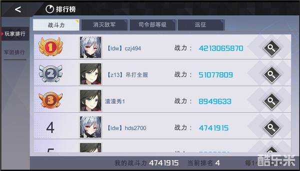 2)玩家个人排行榜中可以查看全服前一百名玩家的排行榜信息,排行榜中包含:战斗力排行、消灭敌军排行、司令部等级排行、远征关卡进度排行。