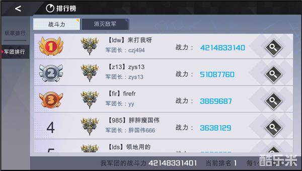 3)军团排行中可以查看全服前一百名军团的排行榜信息,排行榜中包含:战斗力排行、消灭敌军排行。同盟成员的战斗力越高,消灭敌军数量越多,那么军团的排名就会越靠前。
