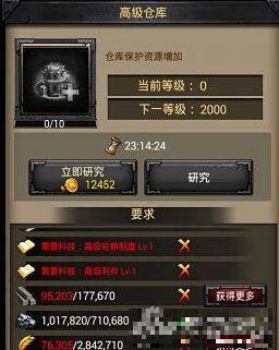 最好玩家如果想要将高级仓库这一个科技研究成功,那么最好是等到中后期,自身的军事、城防等科技研究的差不多的时候再去研究这一个科技。高级仓库玩家想要研究首先需要海量的资源,其次还需要仓库的等级、前置科技达到才行。玩家可以先存好资源,之后将学园等级提升到指定的等级,最后将前置科技学习一级,直奔高级仓库科技就可以了。