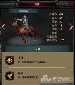 圣殿骑士兵种拥有着44点攻击,32点防御,11点生命,14点速度,从属性上而言,圣殿骑士兵种可以在战斗中对敌方的部队造成大量的伤害。