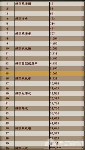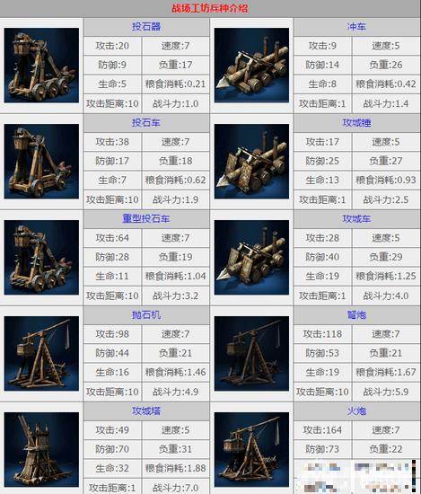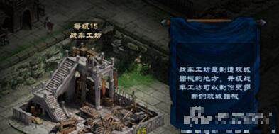 战车工坊介绍:从图中可以看出战车工坊是训练车兵的地方,升级战车工坊可以训练更多高级的兵种,弓兵可以细分为车兵和投石兵两个兵种。战车工坊和兵营一样可以训练十种兵种,1级解锁投石器、4级解锁冲车、7级解锁投石车、10级解锁攻城锤、13级解锁重型投石车、16级解锁攻城车、19级解锁抛石机、22级解锁弩炮、26级解锁攻城塔、30级解锁火炮。小编见到最高的是弩炮,后面的两种需要的等级太高,能达到这个等级的不超过一个手掌。
