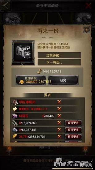 其中最强王国战备中的终极科技:再来一份可以让领主大人们额外获得一份最强王国奖励!掌握了这个小技巧在活动中获得积分以及活动奖励将会事半功倍,红衣服策划拍胸脯保证说这个是极好的绝对不坑!