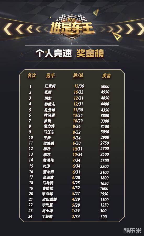 经过6场比赛的巅峰对决,第一名分别是:胡旭、黎绪东、张顺、叶晓明、马驰骋、杨壮。累计奖金榜单如下: