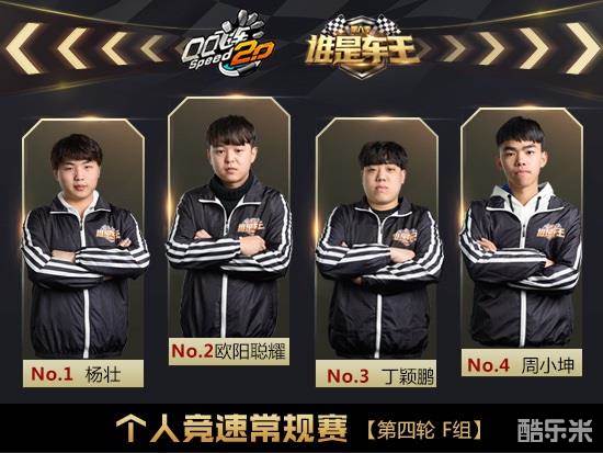 第一场F组的选手是:杨壮、丁颖鹏、欧阳聪耀、周小坤。第一张地图敦煌石窟,起步丁颖鹏抢上第一,杨壮位列第二,进入第二圈前杨壮果断卡位,强势反超,丁颖鹏在后追中也出现失误,杨壮顺利拿下第一。第二张地图1号公路,开局周小坤暂列头名,欧阳聪耀紧随其后,丁颖鹏、杨壮在三四位纠缠在一起,欧阳聪耀逐渐拉近距离,终点前近道周小坤选择撞墙过弯,欧阳聪耀选择漂移过弯,欧阳聪耀利用氮气优势进攻反超,夺得第一。第三张地图老街工地,杨壮领跑一稳到底,积分改写为2次第一。第四张地图火星基地,周小坤占住内线领跑,丁颖鹏后追,长桥处两人发生碰撞,杨壮杀上第一,积分3次第一。第五张地图古城秘境,欧阳聪耀一马当先,身后杨壮距离两个身位,杨壮后追弹墙失误,欧阳聪耀第2次拿下第一。第六张地图霍比特之旅,杨壮开局让位避免碰撞,成功杀上第一,周小坤追击无望,杨壮拿下4次第一,终结比赛。F组最终成绩:第一名杨壮,第二名欧阳聪耀,第三名丁颖鹏,第四名周小坤。