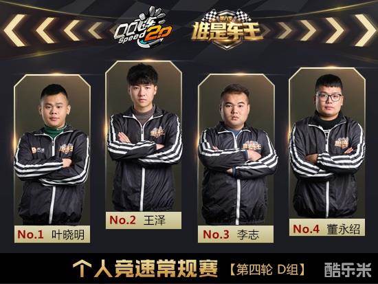 第三场D组的选手是:叶晓明、李志、王泽、董永绍。第一张地图古城秘境,叶晓明成功从李志手中抢下领跑位,夺得第一。第二张地图老街迷宫,叶晓明再次占据优势冲在首位,顺势拿下第2次第一。第三张地图敦煌石窟,王泽发力,开局领先,董永绍跟在第二,两人相互卡位,叶晓明虎视眈眈,抓住机会偷上第一,拿下第3次第一,达到赛点。第四张地图海滨小镇,王泽抓地处于最前方,叶晓明后追,可惜连弯极限跑法失误,王泽稳下第一。第五张地图霍比特之旅,起步王泽领跑,随后李志反超,假弯处四人相互连带,李志依仗位置优势第一冲线,取得首次第一。第六张地图天空之城,叶晓明段位起步遭卡,但在关键点反超成功,率先进线,收下第4次第一。D组最终成绩:第一名叶晓明,第二名王泽,第三名李志,第四名董永绍。