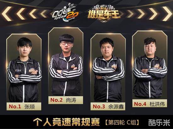 第四场C组的选手是:杜洪伟、尚涛、张顺、余源鑫。第一张地图沁园春,起步张顺领跑,尚涛第二,杜洪伟第三,余源鑫落在第四,近道尚涛失误,杜洪伟补上第二,张顺轻松进线,拿下第一。第二张地图瓦特厂房,开局尚涛领跑,杜洪伟后追,尚涛氮气充足,毫无失误,拿下第一。第三张地图海滨发卡,张顺开局第一,卡位杜洪伟,但遭到余源鑫、尚涛反超,小近道余源鑫失误,连带身后的张顺、杜洪伟,尚涛一马当先取得第2次第一。第四张地图火星基地,会车后张顺领跑,余源鑫追击未果,张顺拿下第2次第一。第五张地图1号公路,余源鑫撞飞杜洪伟冲在第一,一稳到底拿下比赛。第六张地图秋之物语,起步杜洪伟压制对手领跑,随后余源鑫反超,张顺找准机会突破,张顺拿下第3次第一。第七张地图VANS机场,起步杜洪伟一马当先,卡气点余源鑫飞跃上位,第二圈余源鑫卡掉杜洪伟,拿下第2次第一。第八张地图苏格兰场,张顺领跑失误,杜洪伟精彩卡位反超,随后张顺补气夺回位置,余源鑫遭到连带,尚涛杀上第二,进攻卡飞张顺,尚涛拿下第3次第一。第九张地图美洲大峡谷,张顺拿下第4次第一。C组最终成绩:第一名张顺,第二名尚涛,第三名余源鑫,第四名杜洪伟。
