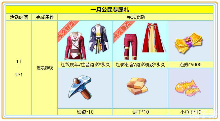 1.1-1.31期间登录游戏,即可轻松领取一月公民专属礼,全新永久非卖精美服饰限时领,以及超多实用小道具,千万别错过哟!