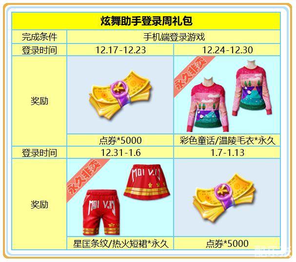 2018.12.17-2019.1.13期间,每周登录助手APP-游戏模块即可领取海量点券,好看又有颜的非卖暖冬上衣,更有热情似火的下装哟!