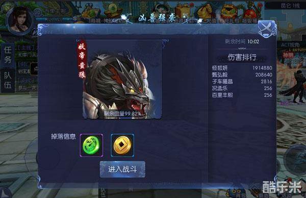凶兽强袭面板会显示该玩法奖励;剩余击杀时间;BOSS剩余血量;伤害排行