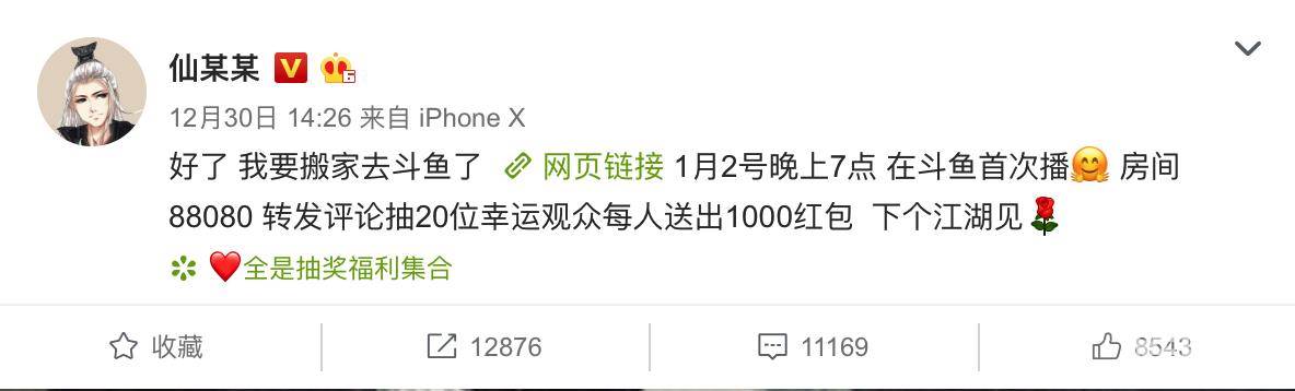首先是已经停播许久的PDD下一个直播平台似乎已经指向斗鱼。2018年12月份中旬,PDD在个人微博上表示,目前正在处理与熊猫直播平台的债务纠纷;在十二月底,从斗鱼游戏直播发出的新年祝福海报中,眼尖的网友就发现藏有“这波百发百中,我必不可死”的句子,而这是PDD直播时候的经典口头禅。