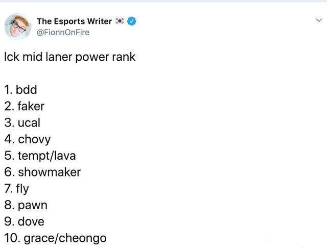 在2018年的最后一天,LCK赛区kespa杯终于落下帷幕,最终GRF以绝对的实力碾压GEN夺得冠军,至此2018全年的LCK比赛也是结束了,而在比赛结束之后,知名的毒奶外媒ESPN记者FionnOnFire就在个人推特分享了他心目中目前的LCK中单排名。