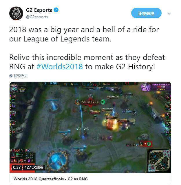 而不知不觉中,时间来到了今年的年底,就在昨天的时候,G2官博也是在自己的推特上写到:刚刚过去的2018年对于我们来说是充满艰难且收获颇丰的一年,下面就让我们来回顾一下今年我们最难以置信的时刻:击败RNG创造了G2的历史!并且还附上了当时比赛的视频。
