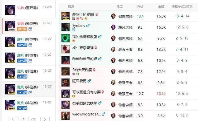而在第二页的战绩中,除开一场重开局和一个SVP外,其他场次均是拿到了MVP,其中卡莎立了大功。值得一提的是,微笑使用的英雄全是ADC,要知道这个版本是上中野的打架版本,微笑可以说是在逆版本Carryy了。