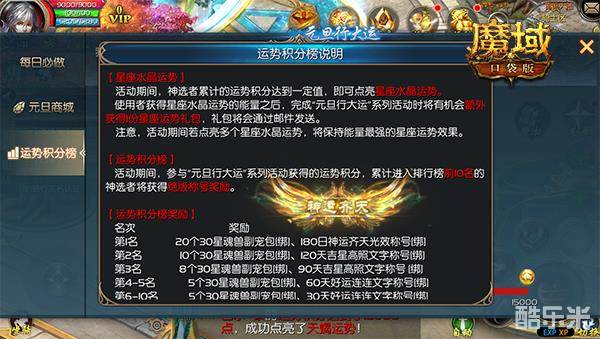 除此之外每位玩家获得的所有运势积分都将统计至“运势积分榜”中,在“运势积分榜”上累计运势积分进入排行榜前10名的玩家,将在活动结束后获得绝版称号奖励。运势伴你新年行大运,新年获豪礼!