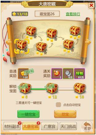 玩家可以通过完成大唐密藏的关卡,收集星星,每章积攒的星星数可以兑换成奖励。同时在完成每关之后,还有对应的奖励给予玩家。