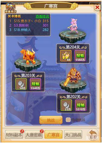 玩家通过挑战广寒宫,获得大量经验及游戏银两。