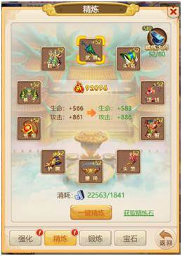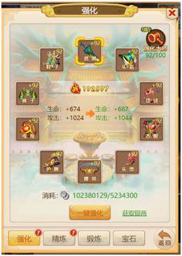 玩家通过锻造界面,消耗对应的材料,升级强化、精炼、锻炼以及宝石系统。