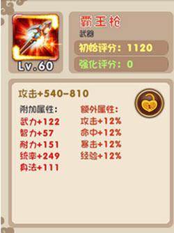 霸王枪,六十级时初始属性增加大量攻击力,攻击+540-810。另外还有武力、智力、耐力、统率、身法等等附加属性。当然作为神器,肯定还有更好的地方,额外属性加成攻击、命中、暴击和经验。而且这些都是初始属性哦,玩家还可以继续进行强化,熔炼等等方式,可以再次大幅度提升装备的属性以及评分。