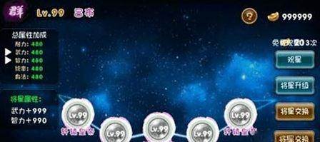 将星等级通过消耗将魂来升级,所以平时获得的蓝将魂或绿将魂都是有用的哦,请保存好!武力型武将观星时候,观到加智力的将星怎么办?点击“将星交换”,可以帮你解决这个问题——只要花费少量元宝,就能将两个武将的将星自由交换啦。