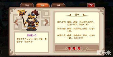 武将缘分是袁氏上将,袁绍、颜良、文丑同时上阵时,攻击增加百分之十五,生命增加百分之十五。河北双雄,颜良,文丑同时上阵,攻击增加百分之二十,先锋大将,颜良华雄同时上阵时,增加攻击和生命各百分之十。颜良和文丑一样都是非常厉害的输出武将,而且从颜良的属性和信息上看,也是一个很不错的前排武将。