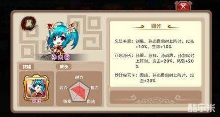 最后编辑于6年前悠闲三国孙尚香女中豪杰属性介绍,孙尚香虽然是属于吴国的,而且是孙氏一族的成员,但是不得不说她还是刘备的妻子,这个关系是吴国和蜀国之间的一个纽带,但是历史上这种婚姻不代表爱情。孙尚香在悠闲三国中是一个以武力为主的武将,但是耐力、智力和身法也是非常高的。