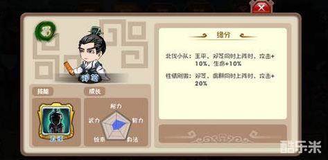 武将技能是直谏,威力117,成长11.7,单体攻击,攻击敌方生命最少的目标,百分之八十的概率附加目标封印,持续两个回合。武将缘分两个,一个是北伐小队,王平邓芝同时上阵,攻击和生命各增加百分之十。性情刚傲,邓芝虞翻同时上阵,增加攻击百分之二十。不管在历史上多么厉害,但是在游戏中的品质没跟上的话,用途都是非常小的。