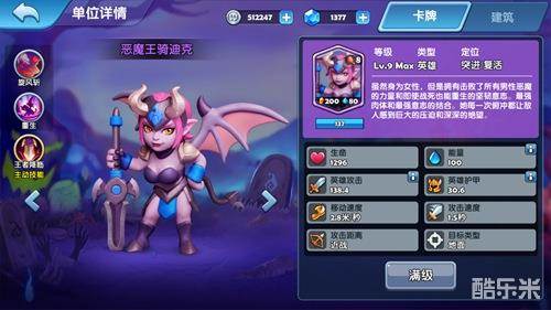 恶魔王骑迪克属于突进英雄,只能攻击地面单位。相比其他英雄,她的生命值较高。她可以释放主动技能“王者降临”眩晕一定范围内的敌人施加减益状态并造成伤害。被动技能“旋风斩”使得迪克可以在对敌人造成范围伤害的同时恢复自身血量。被动技能“重生”使得迪克死后可以复活。