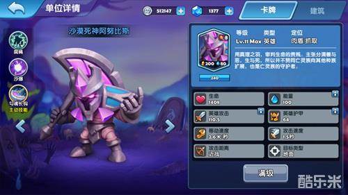 沙漠死神阿努比斯只能攻击地面单位。相比其他英雄,他有着很高的生命值和护甲值,但是他的攻击力很低。阿努比斯可以释放主动技能“勾魂长钩”把敌人勾到身边。被动技能“腐蝇”使得阿努比斯可以对附近敌军造成持续伤害。被动技能“沙爆”使得阿努比斯死亡后对身边的敌军造成大量伤害。