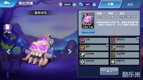 瘟疫战车属于远程攻城单位。相比其他II本兵,瘟疫战车有着很高的攻击力和较远的攻击距离,但是它的攻击速度极慢,生命力和防御力也很低。技能“浮尸遍野”使得瘟疫战车可以在敌人附近留下一个持续5秒的尸体。
