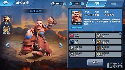 链锤骑兵属于突进单位。相比其他III本兵,他有着较高的生命力、攻击力、防御值和移动速度。专属技能“强拆”使得链锤骑兵能优先攻击建筑护甲单位,并对其造成更高的伤害。技能“锤锤冲击”使得他能对路径上的敌人造成120%的攻击伤害并降低敌人的移动速度和攻击速度。