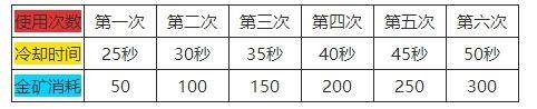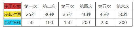 回城冷却时间:冷却时间随着使用次数的增多而增加,在未完成冷却时再次使用“回城”需要消耗的金矿也随使用次数的增多而增加。