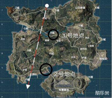 一进入游戏打开地图即可看见飞机航线,而每一局游戏的航线都不相同。一般玩家都会选择降落在航线附近的热门城市,而离航线距离较远的地方降落的玩家较少。那么我们就可以在落地后,立刻寻找载具向远处资源点前进。例如上图,航线偏左,我们可以选择降落在①号地点,然后驾车前往防空洞、监狱,也可以降落在②号地点,驾车前往军事基地和N港。