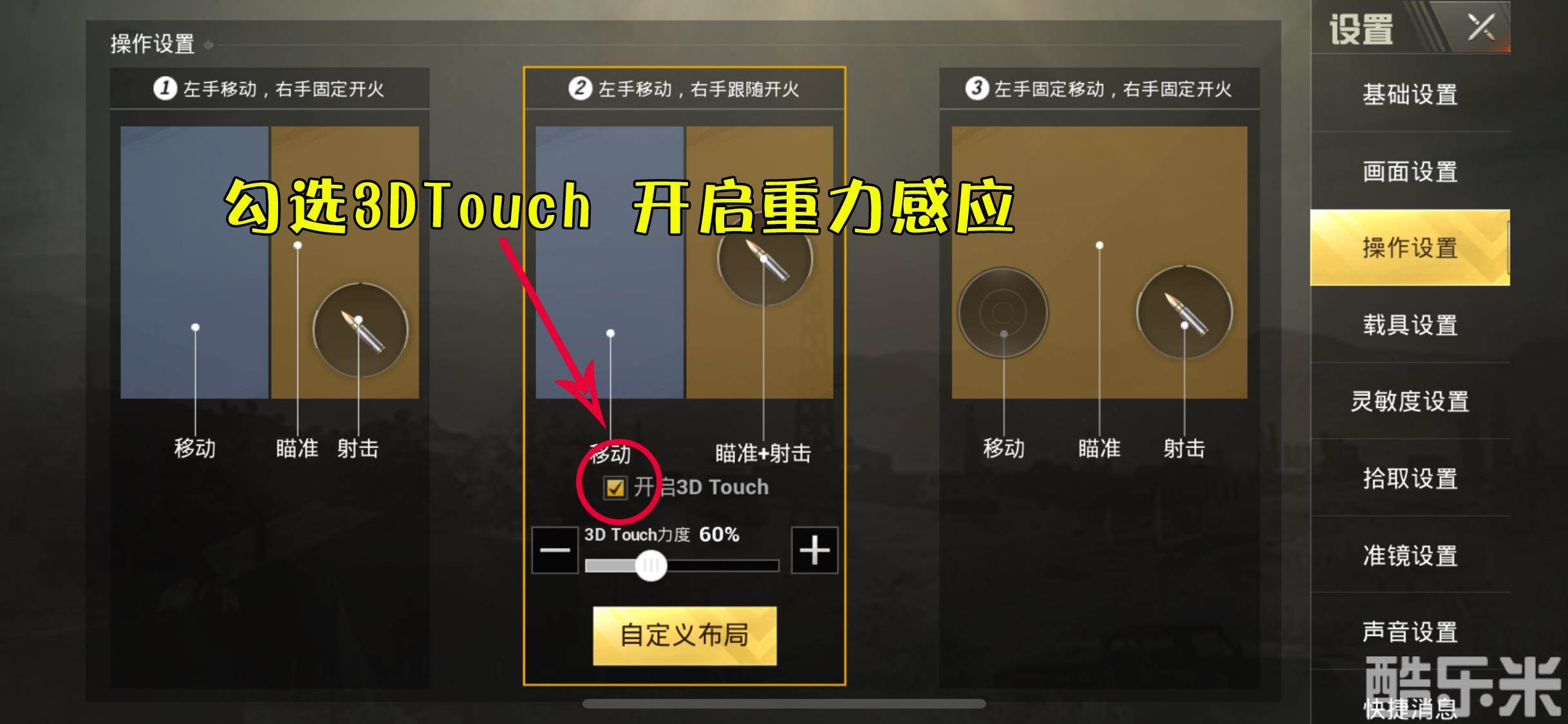 在具体操作设置上,银时的3DTouch力度设置为60%。在设置界面中,右边是探头和开镜,控制好力度的话都可以实现按键然后自动开枪。单独的开火键则用于使用单发狙或者M16等非自动枪械。另外就是银时的陀螺仪设置,可以进行射击时的微调或跟枪扫射,具体参数如下。